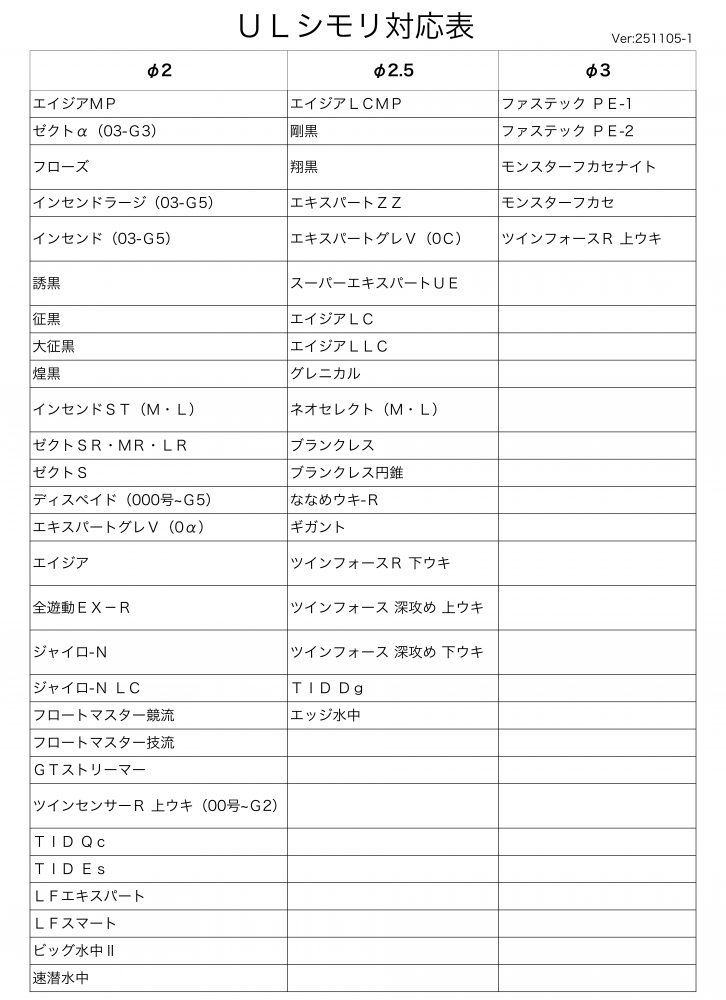 ULクッションはクッション性能を優先した構造・素材となっています。素材の特性上、使用するウキの重量や使用状況によっては、ハリスと道糸の直結部をウキがすり抜ける恐れがあります。また、道糸・ハリスを使ったウキ止めの場合、ULクッション内部にウキ止めが噛み込むことがありますのでご注意ください。